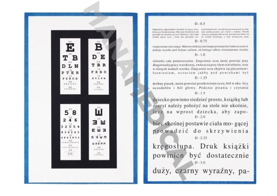 Tablica do badania ostrości wzroku do bliży , na 40 cm. Zadrukowana dwustronnie, kartonowa. Skala Snellen .
